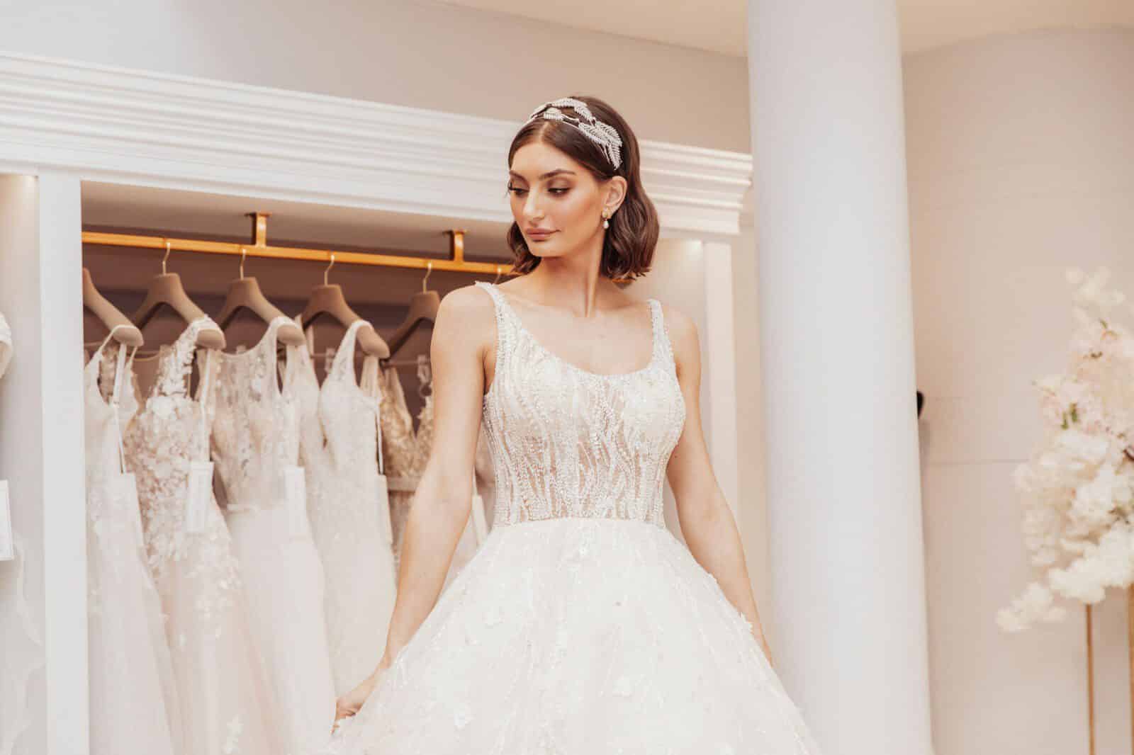 Luxurious organza coupled with tulle create beautiful Analena. Lavish beaded lace and delicate flowers adorn this enchanting ball gown featuring a scoop neckline, seductive low back and cathedral train.