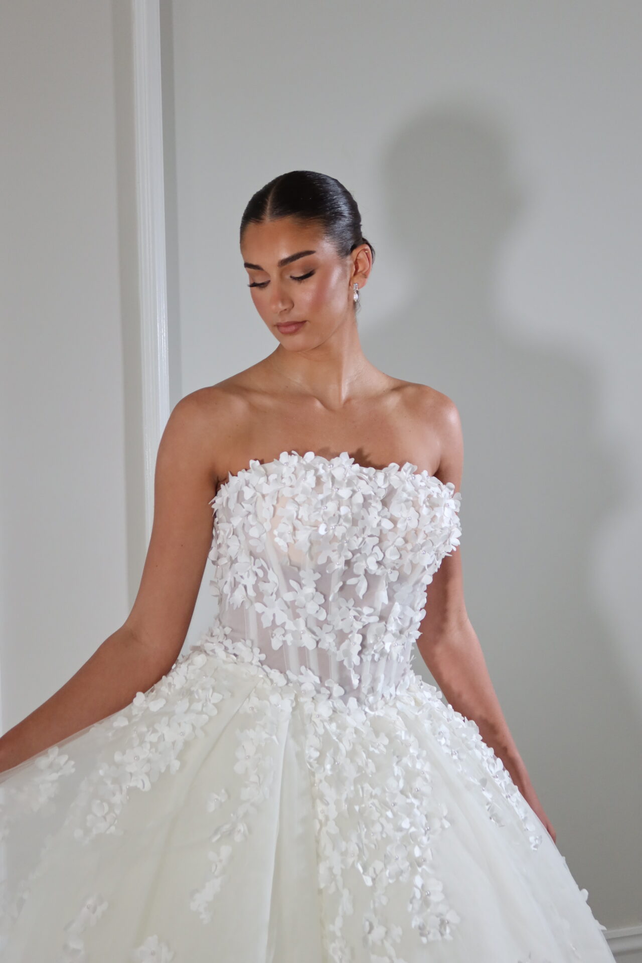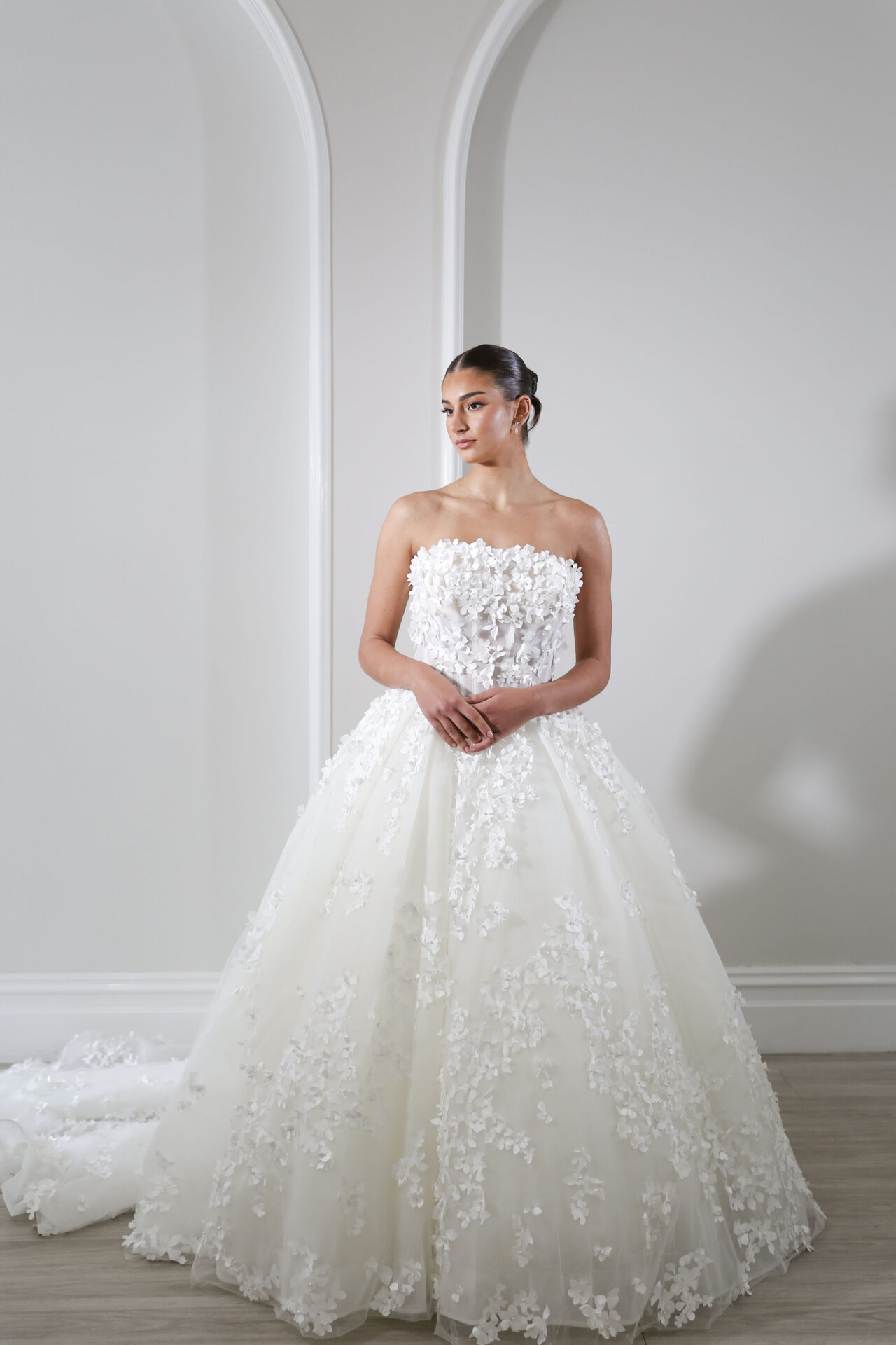The Aveline gown is crafted in airy tulle and adorned with 3D floral lace. The strapless bodice features an illusion corset and a softly curved neckline which flows effortlessly into a ballgown skirt and sweeping train. Accented with subtle pearl beading, Aveline makes an unforgettable statement.
