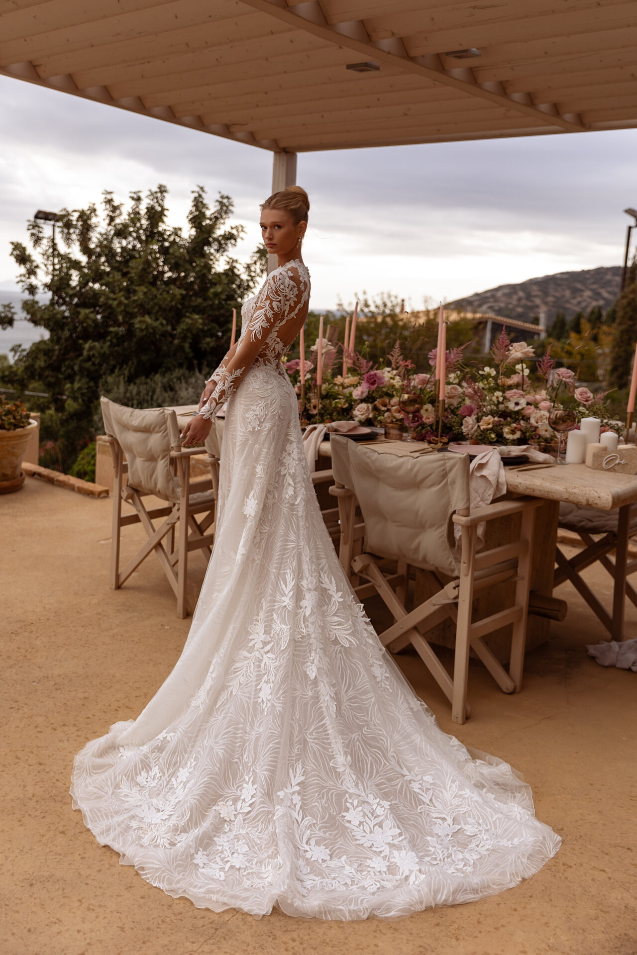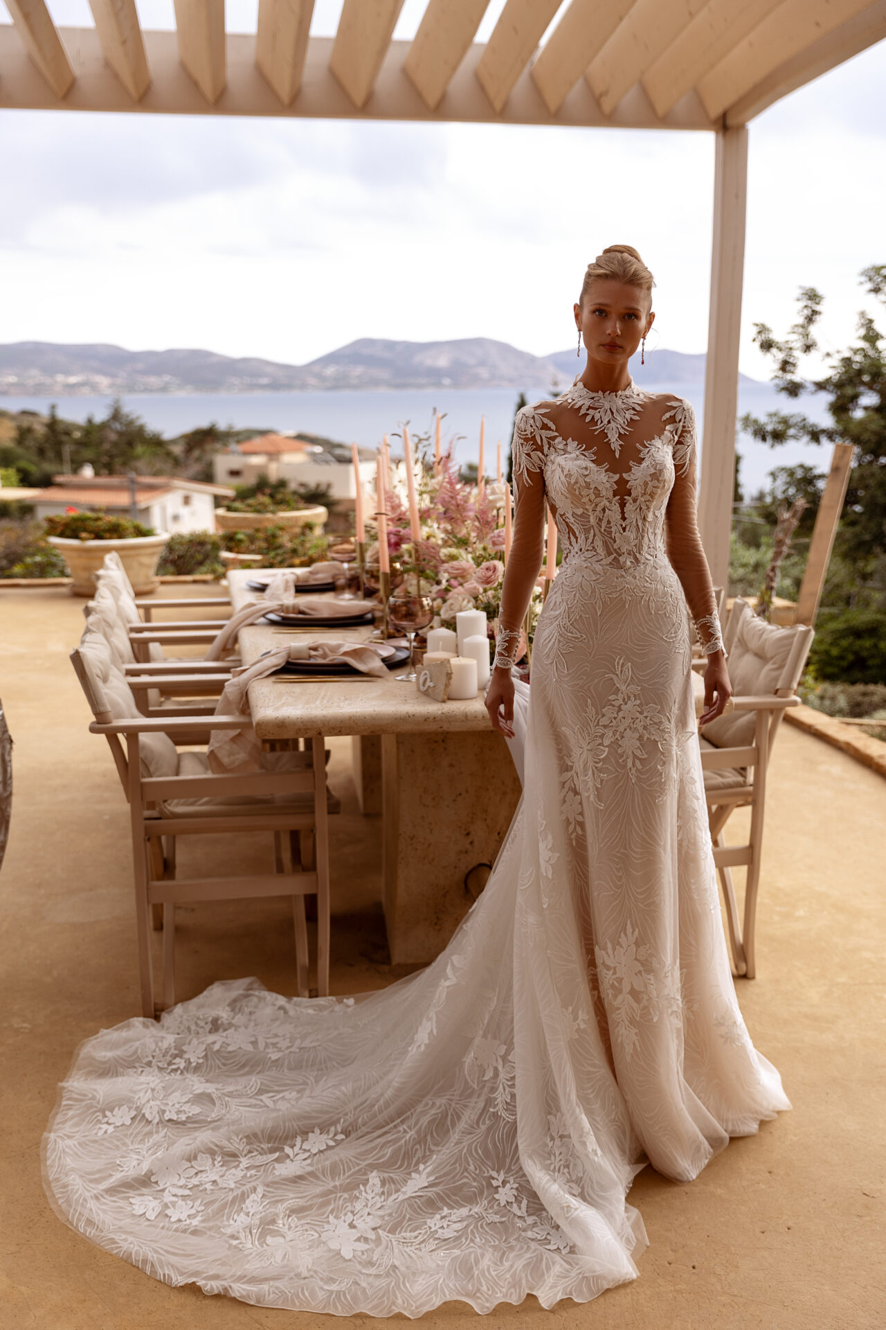 A bohemian gown featuring long sleeves, a keyhole back, and intricate lace. The underlay design enhances the overall beauty, evoking a romantic wedding aesthetic.