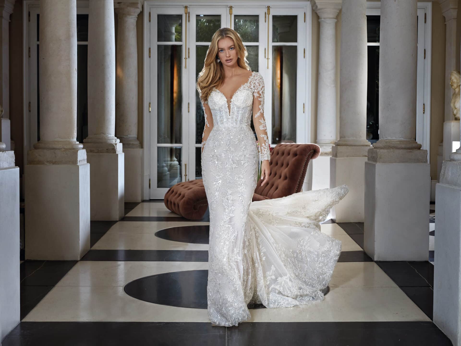 Looking for a captivating gown that offers two looks in one? Then look no further than the Ella gown. Sparkling tulle peaks out behind the beaded lace embroidery with a flared silhouette, long sleeves, a v-neckline and low back. Ella can be paired with a mesmerizing detachable train.