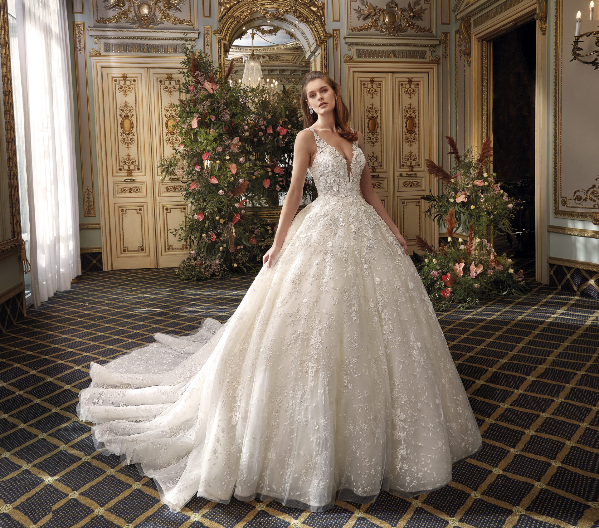 Soft romance and timeless bridal style unite to create the breathtaking Viveca gown. This ball gown flatters all body types with its lush silhouette and sleeveless v-neckline featuring scattered 3D lace and sparkling decorations.