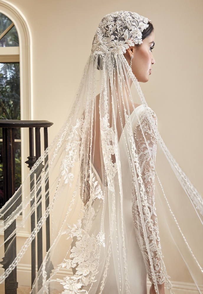 Mesmerizing juliet cap veil with a 1920s vibe. Mix and match to create your perfect look. Color Shown: Ivory | Matching Dress: Demetrios 1035